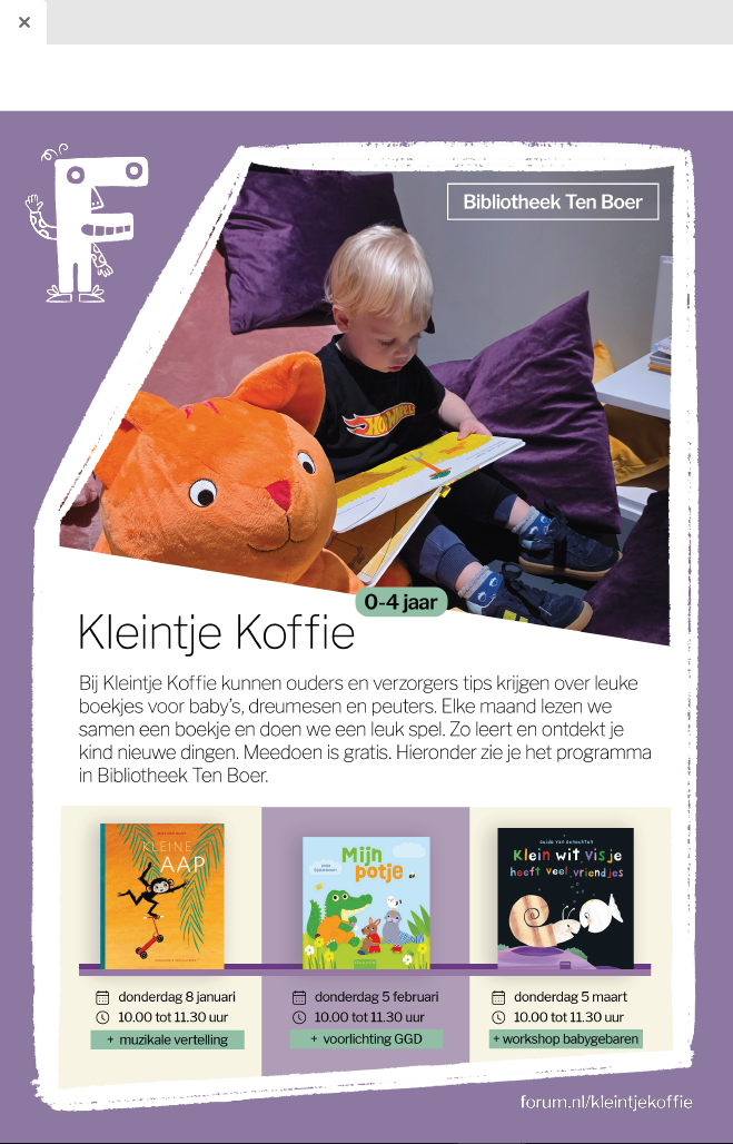 Onderwerpen m.b.t. voorlezen, mediaopvoeding of muziek bijvoorbeeld. Loop gerust even binnen, het is gratis en je mag zo lang of kort blijven als je wilt. Wil je niets missen van een presentatie of voorstelling, zorg dan dat je er op tijd bent.