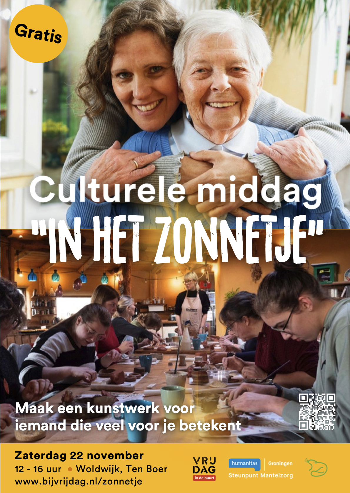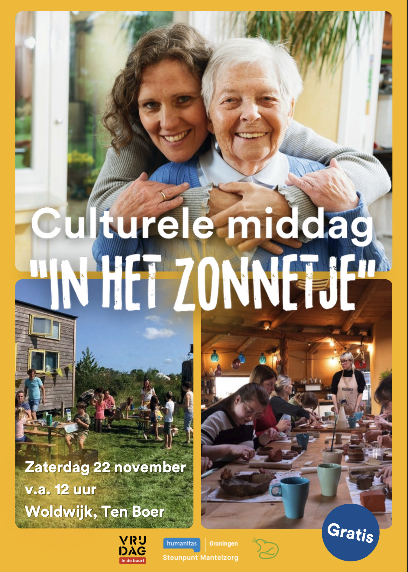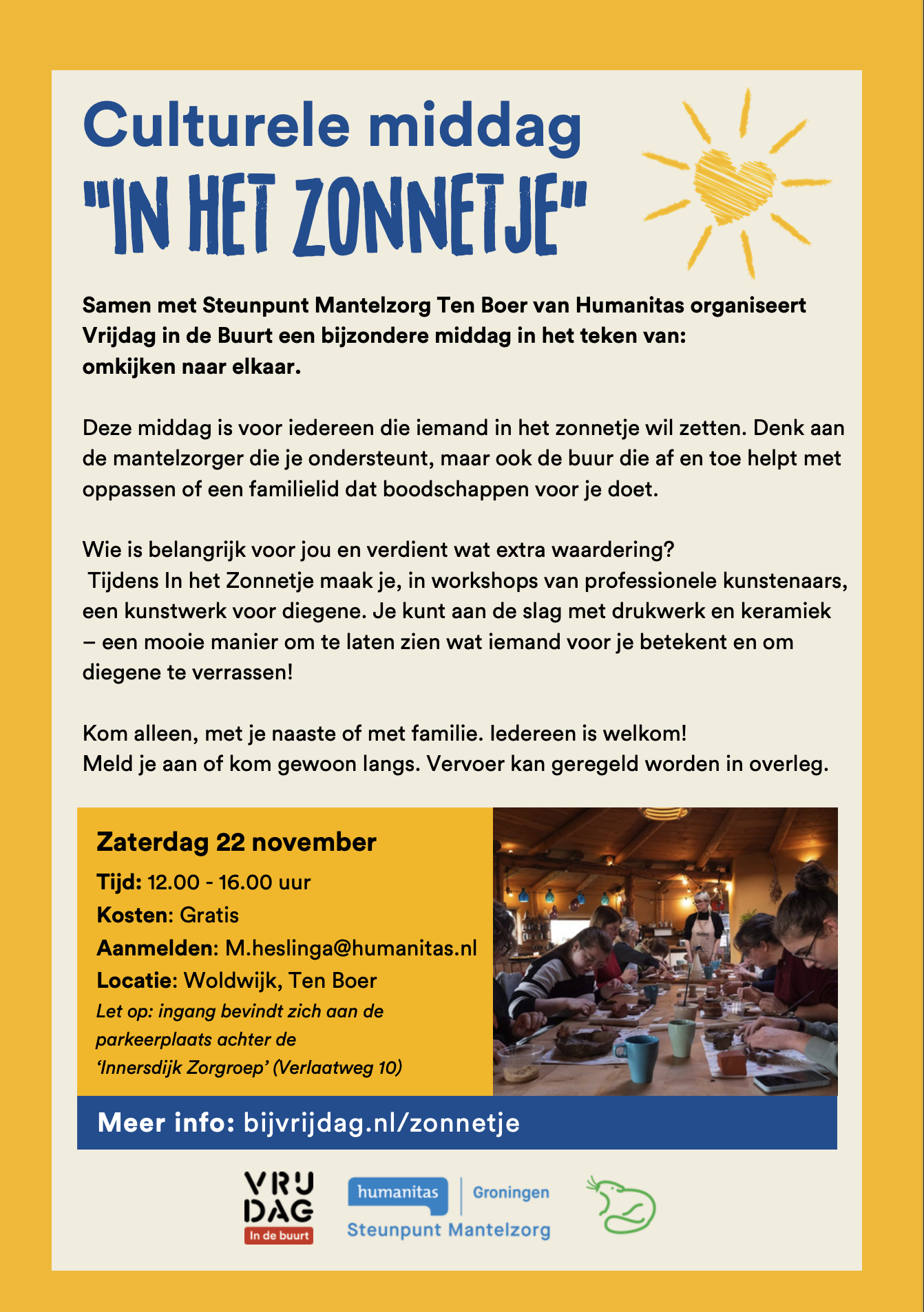 Samen met Steunpunt Mantelzorg Ten Boer van Humanitas organiseert Vrijdag in de Buurt een bijzondere middag in het teken van 'omkijken naar elkaar'.