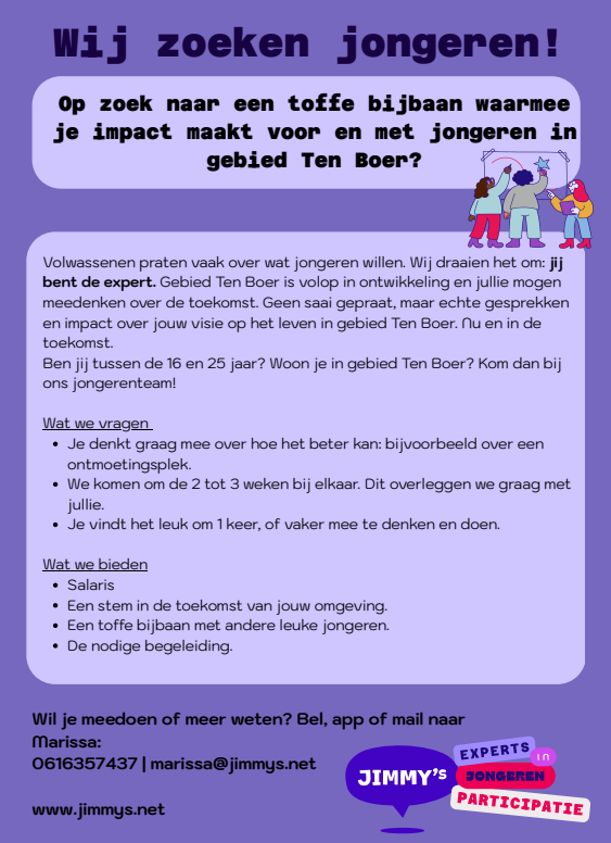 Hoe is het leven als jongere in het gebied Ten Boer? Wat is jouw visie, nu én voor de toekomst? Wat moeten we behouden en wat kan beter? Denk en praat mee! Via deze weg krijgt jouw stem een plek in het gemeentelijke beleid.