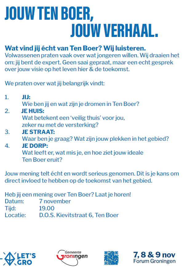 Volwassenen praten vaak over wat jongeren willen. Wij draaien het om: Jij bent de expert. Geen saai gepraat, maar een echt gesprek over jouw visie op het leven hier & de toekomst.