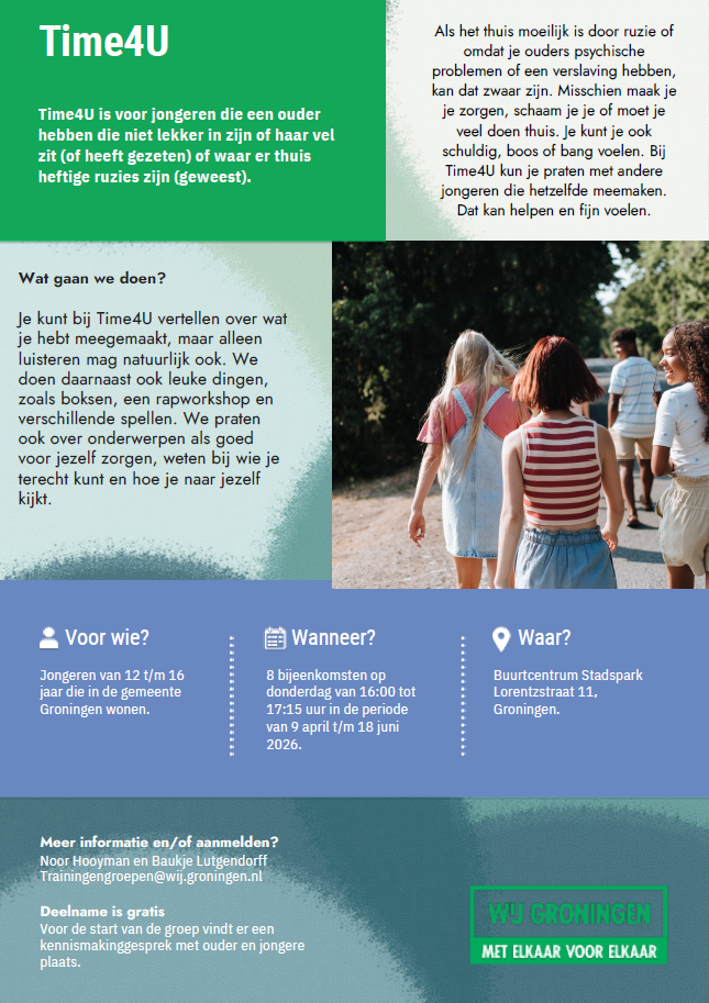 Jongeren kunnen bij Time4U vertellen over wat ze thuis meemaken. We praten ook over onderwerpen als goed voor jezelf zorgen, gevoelens, weten bij wie je terecht kunt en hoe je naar jezelf kijkt. We doen daarnaast ook leuke dinge, zoals boksen, een rapworkshop en verschillen de spellen.