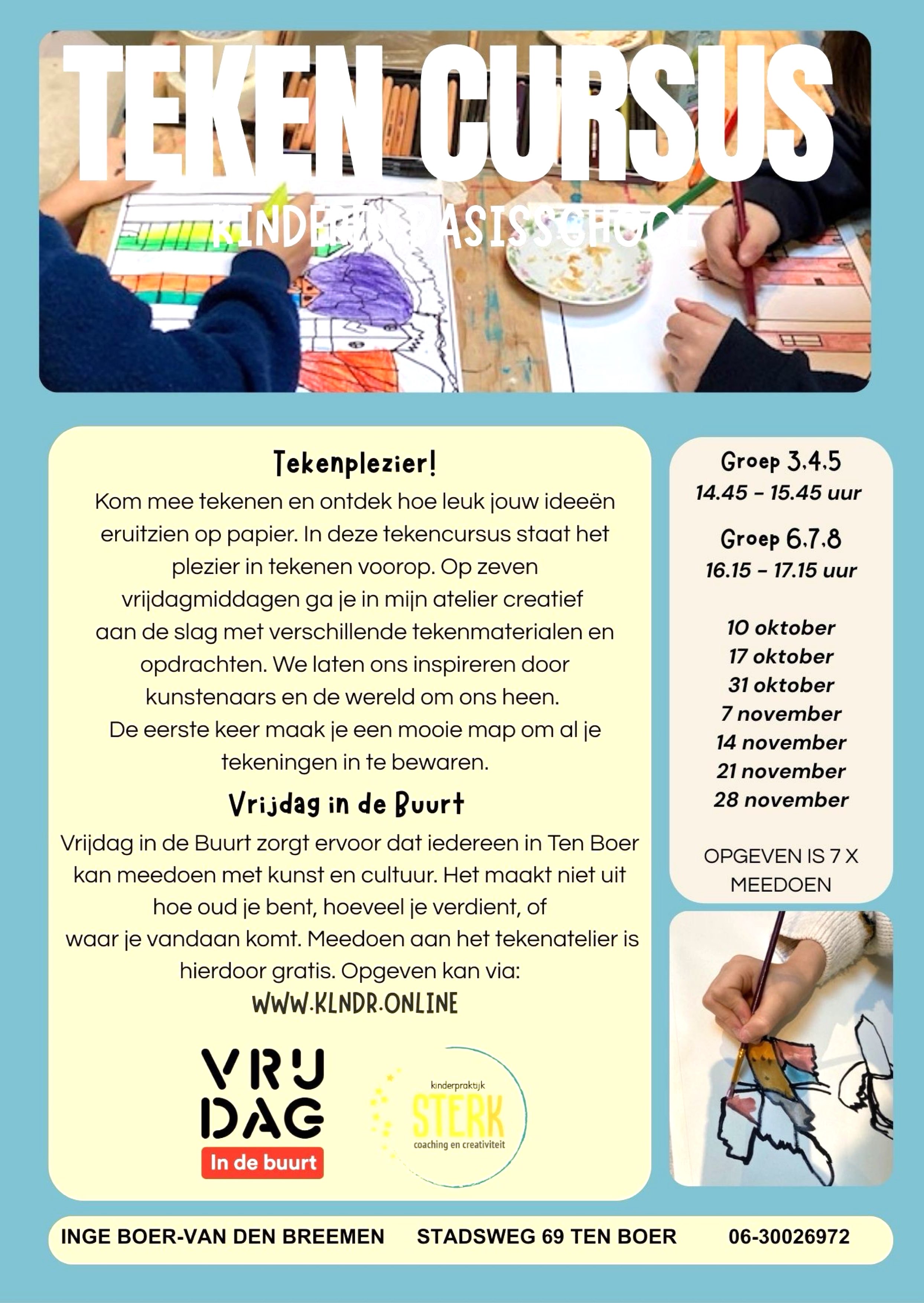 In deze tekencursus staat het plezier in tekenen voorop. Op 7 vrijdagmiddagen ga je in het atelier van Inge Boer aan de slag met verschillende materialen en opdrachten. We laten ons inspireren door kunstenaars en de wereld om ons heen. De eerste keer maak je een mooie map om al je tekeningen in te bewaren. (Er zijn 2 cursussen voor 2 leeftijdsgroepen.)