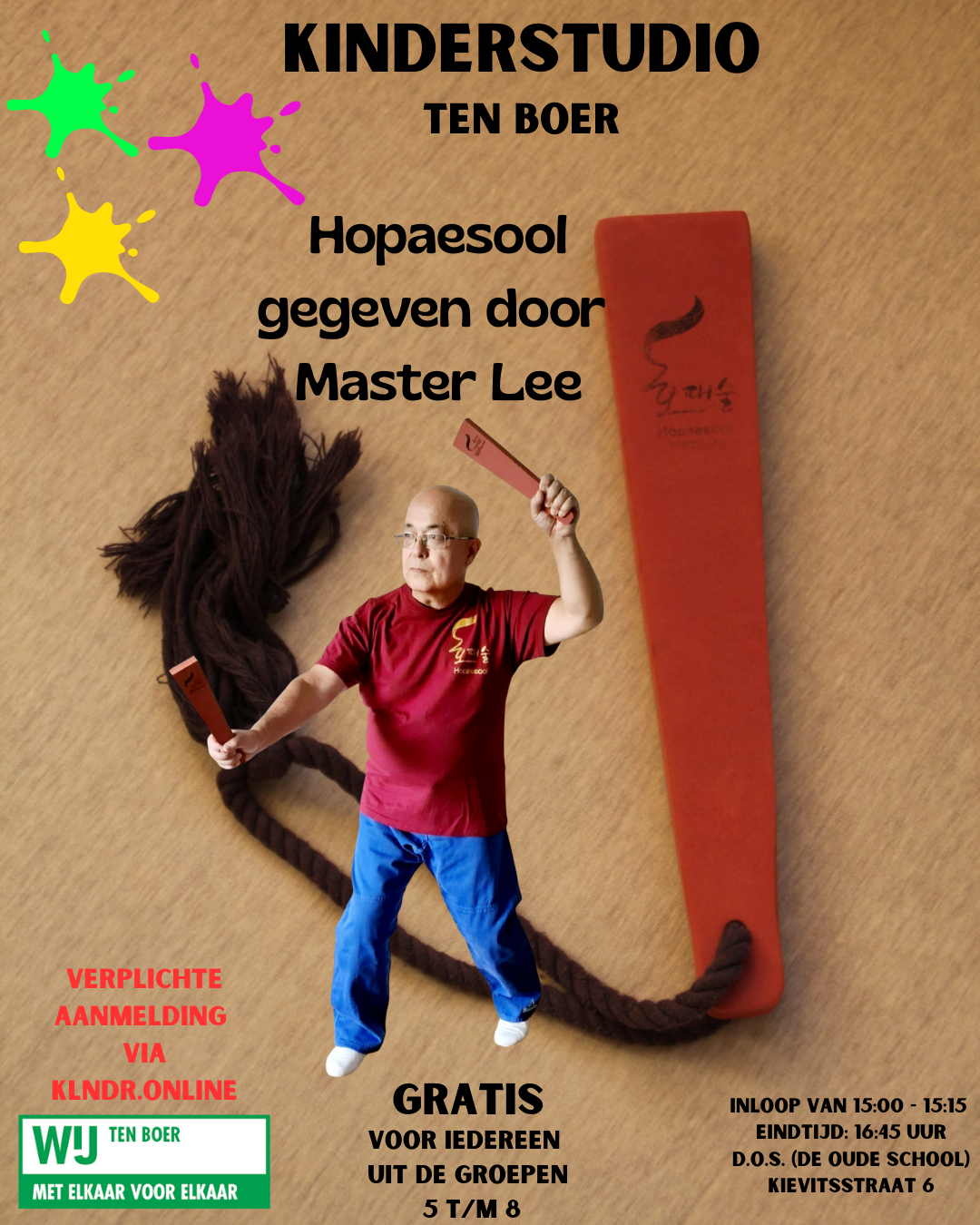 Kinderen gaan onder leiding van Master Lee allerlei oefeningen doen met een rubberen Hopae.