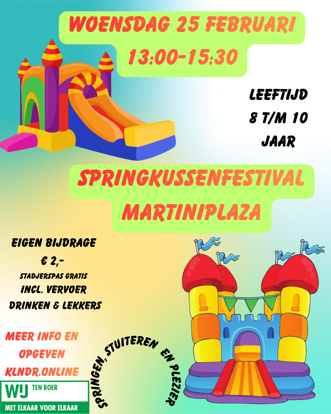 Springen, klimmen en klauteren in het het mega indoor springkussenfestival in Martiniplaza. Eventueel nog chauffeur nodig.